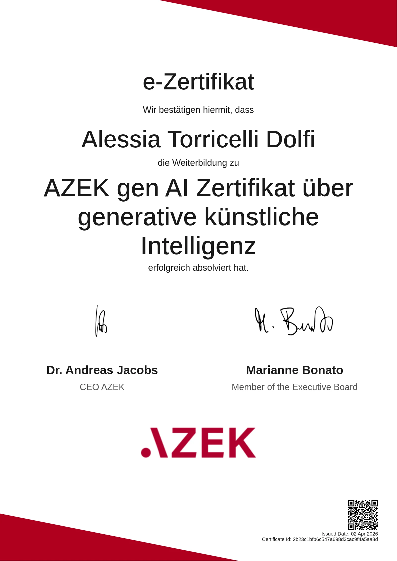 Alessia Torricelli Dolfi | AZEK gen AI Zertifikat über generative künstliche Intelligenz
