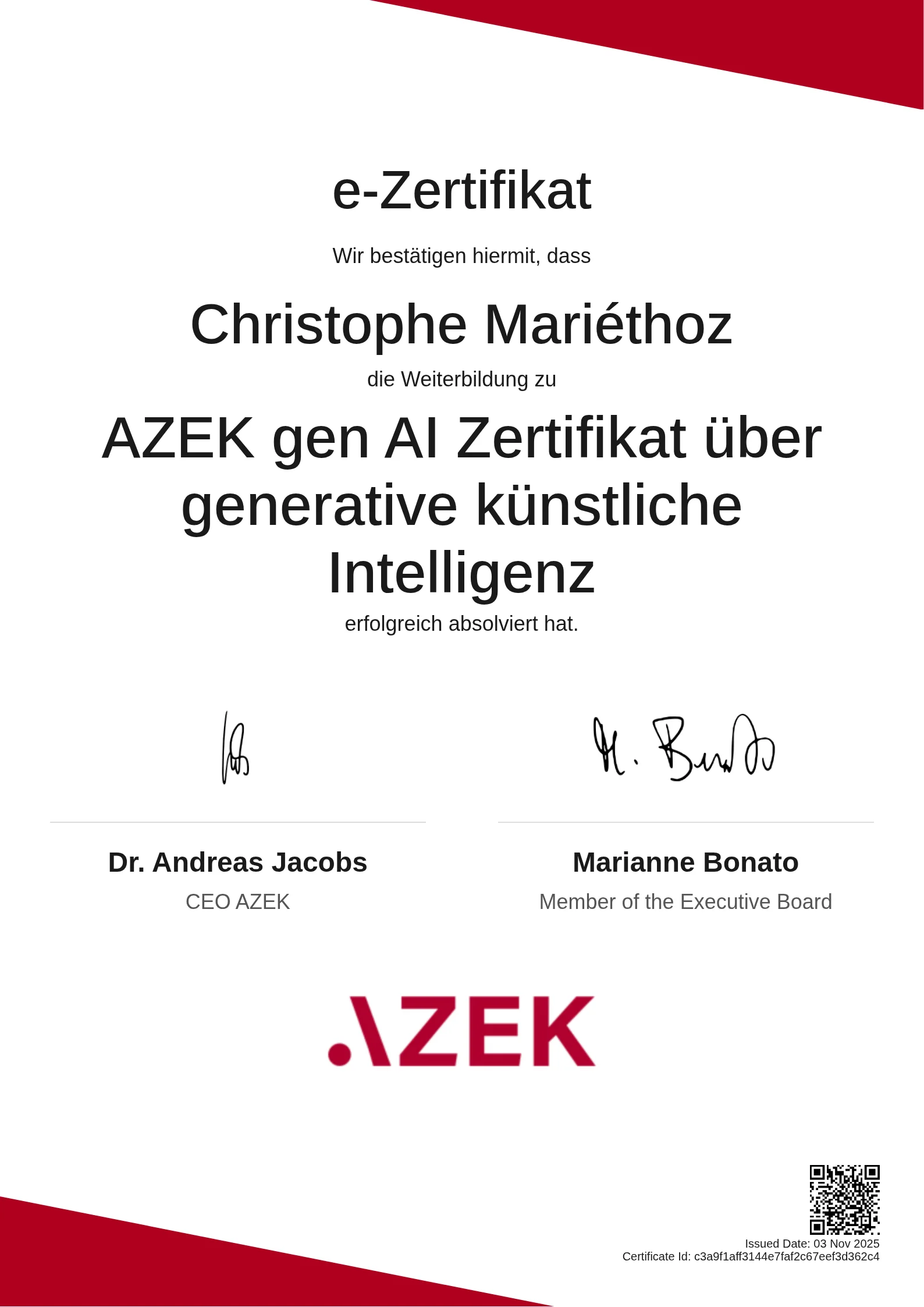 Christophe Mariéthoz | AZEK gen AI Zertifikat über generative künstliche Intelligenz