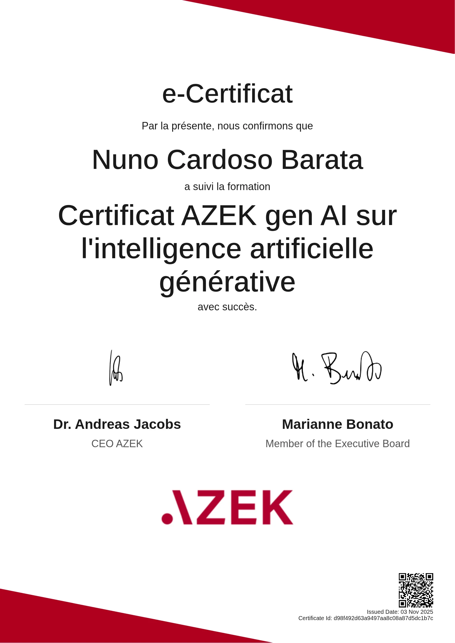 Nuno Cardoso Barata | Certificat AZEK gen AI sur l'intelligence artificielle générative