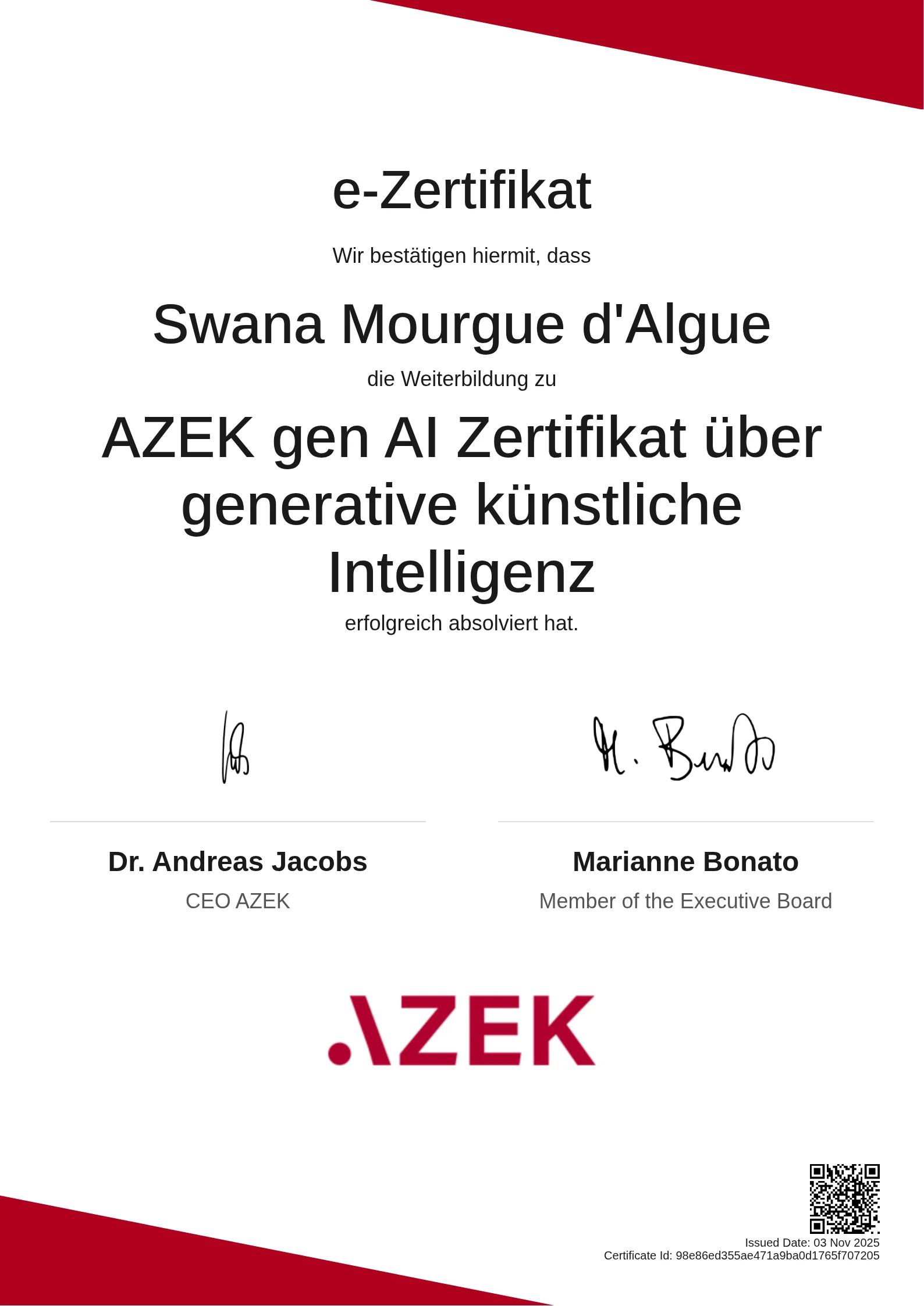 Swana Mourgue d'Algue | AZEK gen AI Zertifikat über generative künstliche Intelligenz